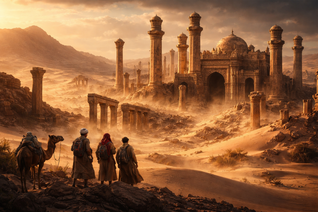 No coração abrasador da Península Arábica, onde o vento redesenha as dunas como páginas de um livro antigo, sobrevive uma história que parece impossível de ignorar. Fala-se de uma cidade majestosa, erguida com colunas imensas, repleta de riquezas e orgulho, que teria desaparecido em um único dia, tragada pelo próprio deserto. Para alguns, seu nome é Ubar. Para outros, Iram, a cidade das muitas colunas. Para muitos, ela é simplesmente a “Atlântida das Areias”.