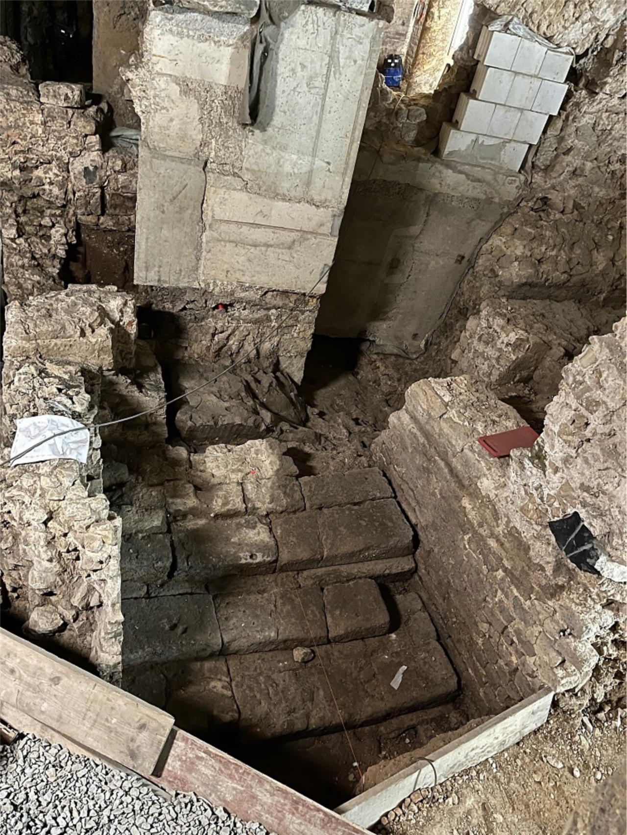 Outra descoberta relevante é a fundação da abside de uma basílica romana do século IV. A estrutura apresenta até quatro metros de espessura e, após análise detalhada, verificou-se que sua composição inclui camadas organizadas de tufo vulcânico, basalto e calcário, unidas por argamassa contendo fragmentos de tijolo e cascalho. Antes das escavações, o local era identificado apenas como uma leve depressão na superfície da praça. A exposição da fundação evidencia transformações urbanas ocorridas durante a Antiguidade Tardia, quando edifícios administrativos e possivelmente eclesiásticos passaram a integrar a paisagem da cidade.