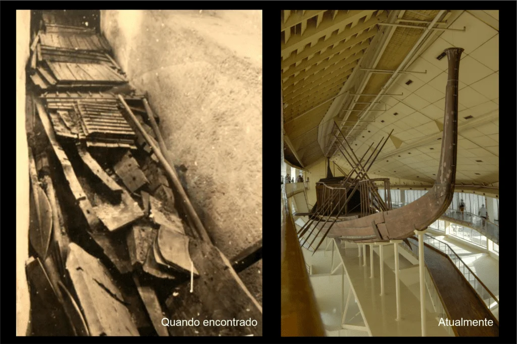 Quando descobertos, os barcos estavam desmontados, com suas peças cuidadosamente organizadas nos poços subterrâneos. O primeiro barco, composto por 1.224 componentes, exigiu 16 meses de trabalho minucioso para ser remontado. Após décadas em exibição no Museu do Barco Solar, próximo à pirâmide, ele foi transferido em 2021 para o Grande Museu Egípcio, onde é preservado em condições ideais. O segundo barco, por sua vez, apresentou desafios maiores. Sua escavação só foi retomada em 2009, e a reconstrução contou com tecnologias como escaneamento 3D para alinhar as peças originais.