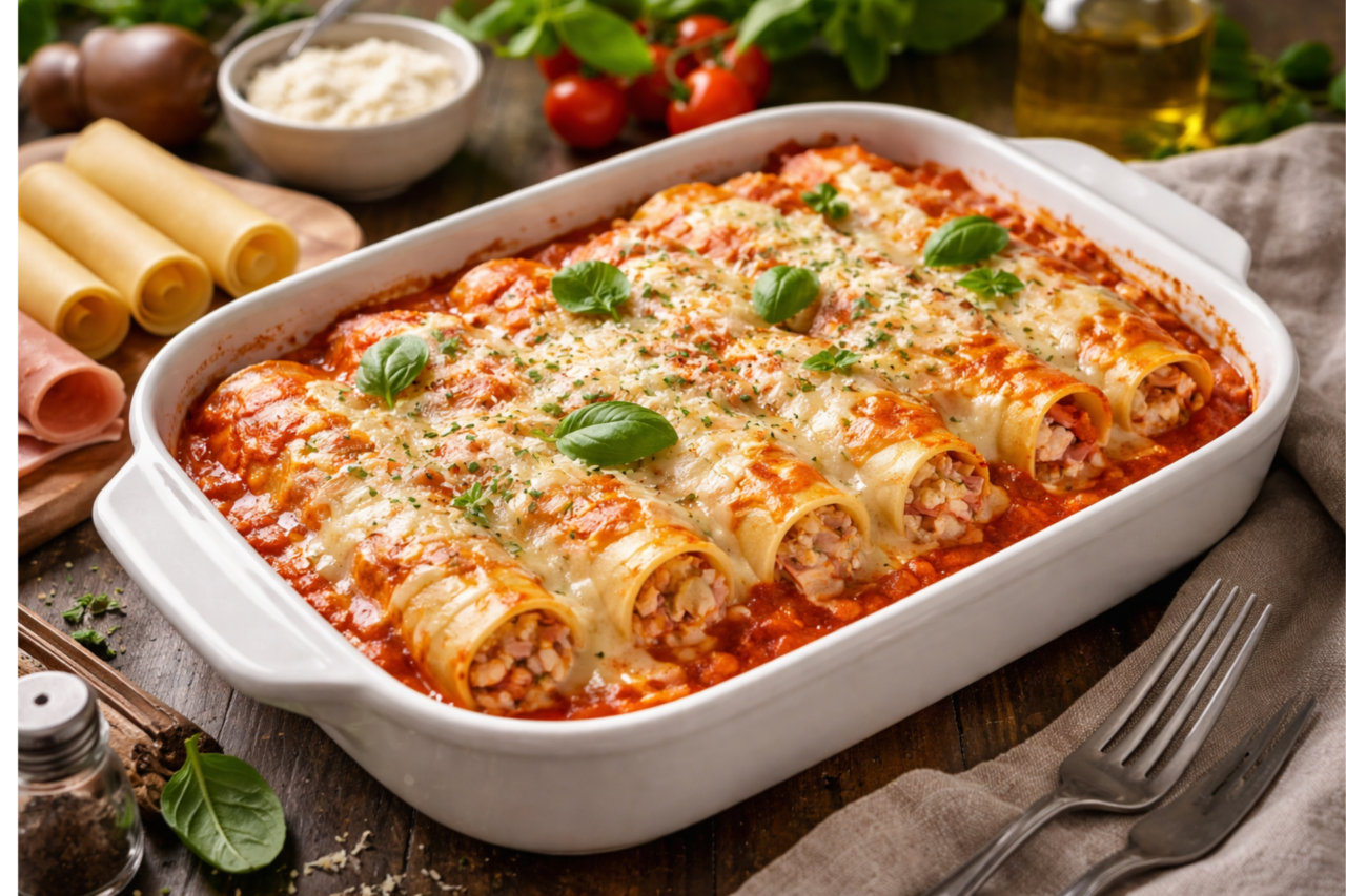 Nesta receita, a proposta é apresentar um canelone recheado clássico, com presunto e queijo, finalizado com molho de tomate e molho branco. Essa combinação equilibra suavidade e intensidade, valoriza a massa e agrada a diferentes paladares. O preparo exige atenção aos detalhes, mas não é complexo. Com organização e ingredientes de qualidade, o resultado é um prato consistente, aromático e visualmente convidativo.