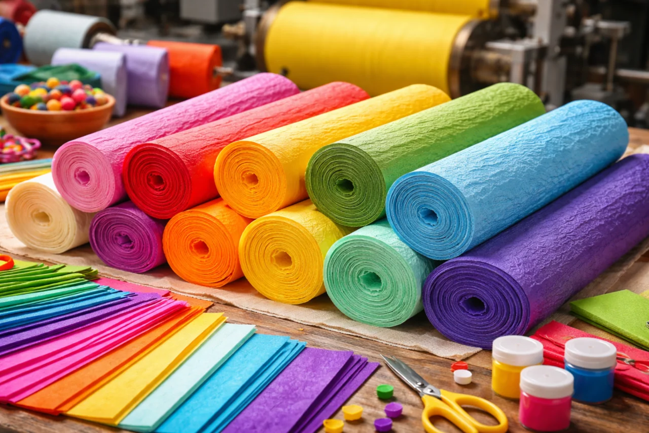 O papel crepom também absorve bem umidade e tintas, o que o torna ideal para trabalhos escolares, flores artificiais e cenografias, onde a moldagem manual é essencial.