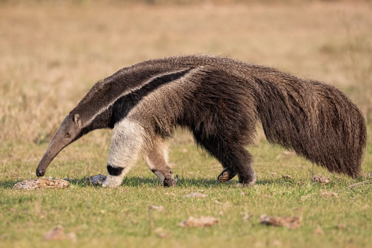 O nome “tamanduá-bandeira” vem justamente de sua cauda longa e peluda, que se abre como se fosse uma bandeira. Essa característica não serve apenas para impressionar: ela é usada como proteção contra o sol e até como cobertor durante o descanso, ajudando a manter a temperatura corporal em noites frias.
