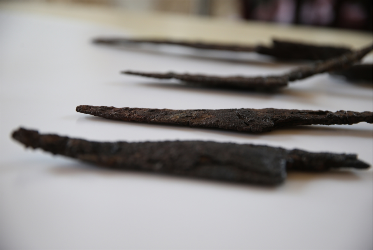 Os artefatos foram encontrados na seção de cozinha de uma estrutura identificada pelos pesquisadores como Complexo de Banhos. Durante as escavações, foram localizadas quatro facas associadas a pedras de afiar, todas em diferentes tamanhos, mas com características semelhantes.
