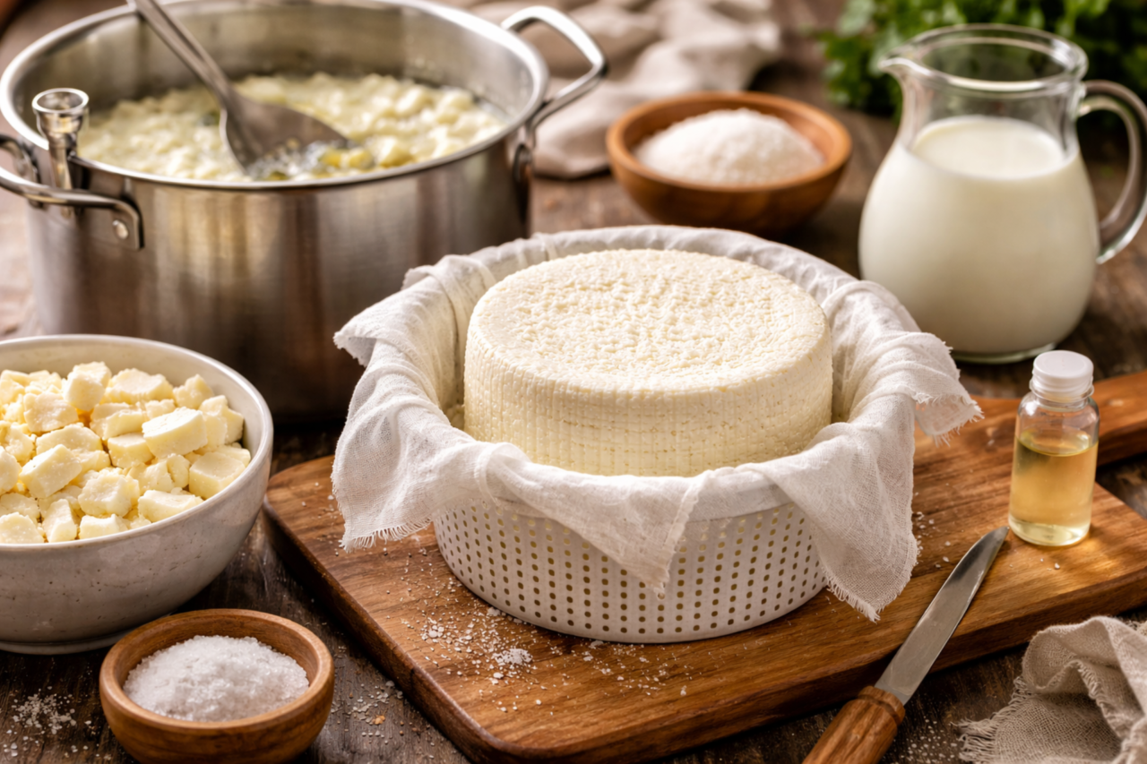 Embora não sejam ingredientes, alguns utensílios são indispensáveis: uma panela grande de inox, um termômetro culinário, uma colher longa, uma faca, um pano limpo ou gaze e uma forma perfurada ou peneira para moldar o queijo.