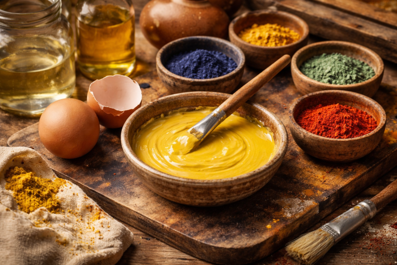 A têmpera é uma das tintas mais antigas da história da arte organizada. Sua base é simples e engenhosa: pigmentos misturados a gema de ovo e água. Essa combinação cria uma tinta de secagem rápida, acabamento fosco e grande durabilidade.